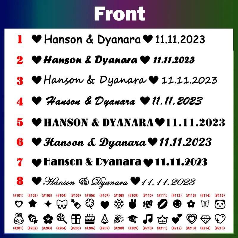 Emoji can be added to the customized text (if there is no note for emoji). It is made by default as“♥”。 If not needed“♥”, Additional clarification is required when making remarks, stating “without hearts”