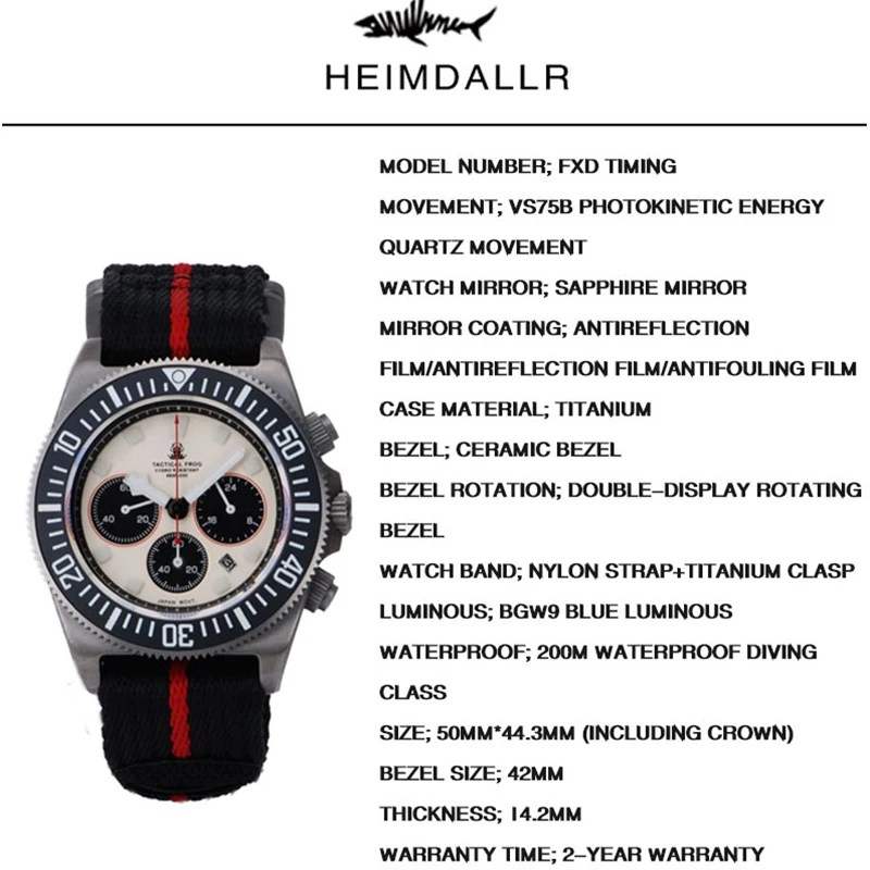 Tactical Frog FXD Titanium Dive Sports Watch Men 42mm VS75B Solar-Powered Quartz Sapphire Glass 200M Waterproof BGW-9 Luminous
